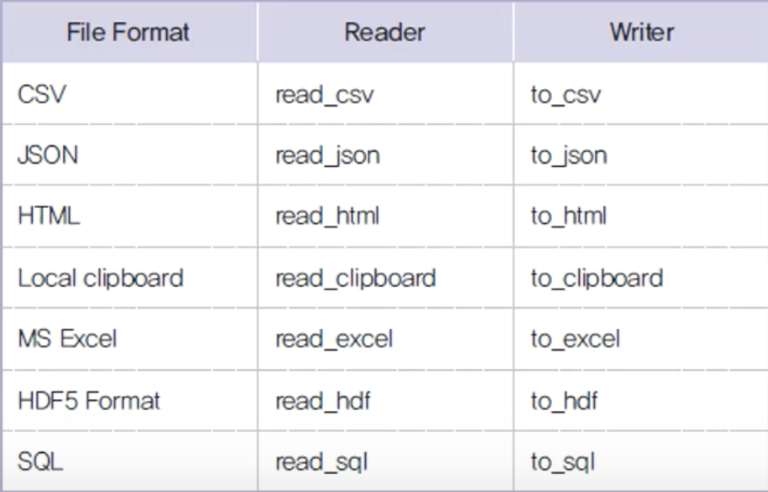The pandas I/O API is a set of top level reader functions accessed like pandas.read_csv() that generally return a pandas object. The corresponding writer functions are object methods that are accessed like DataFrame.to_csv(). Below is a table containing av
