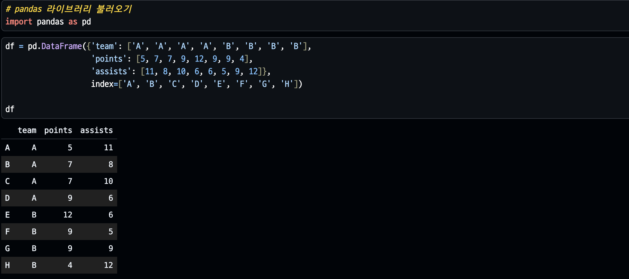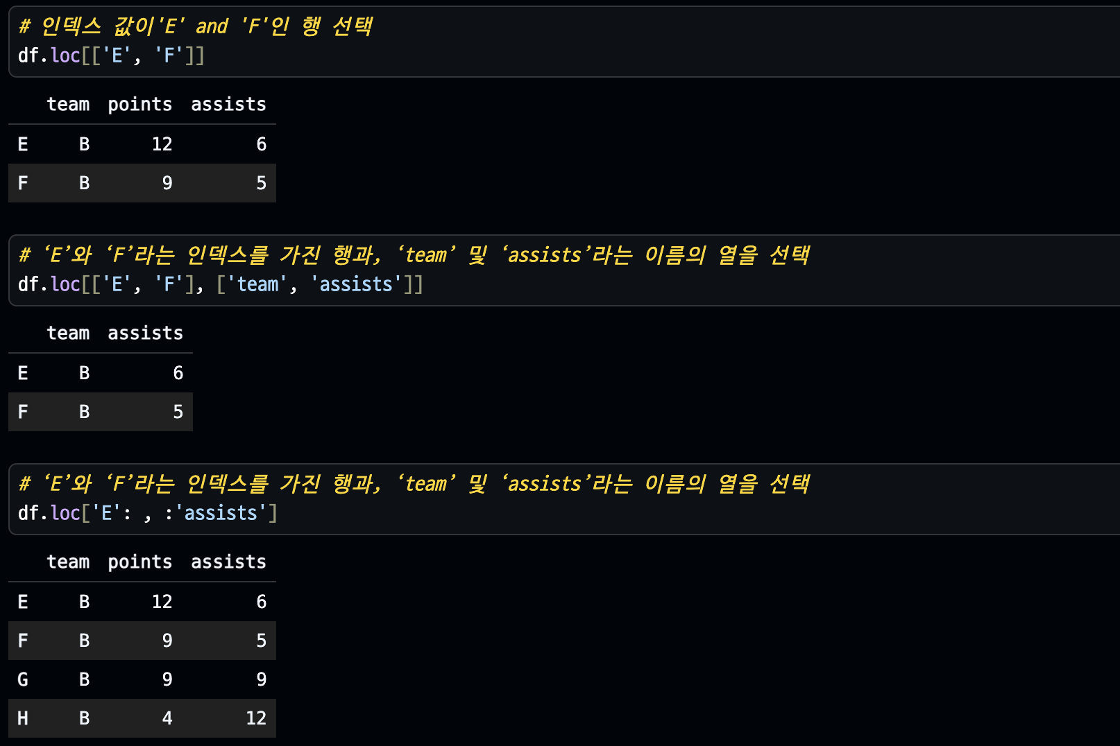두번째 코드는 row('E', 'F')와 column('team', 'assists')을 모두 지정하여 선택한 예시이다