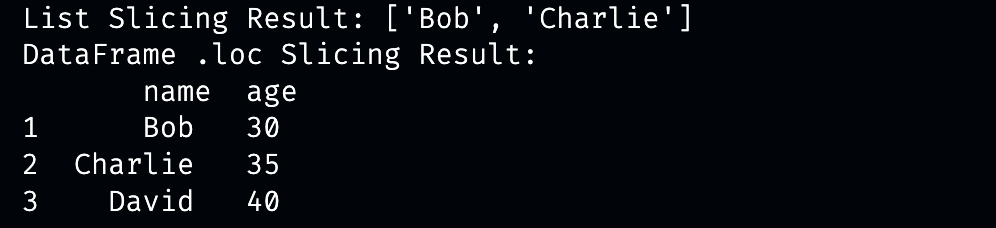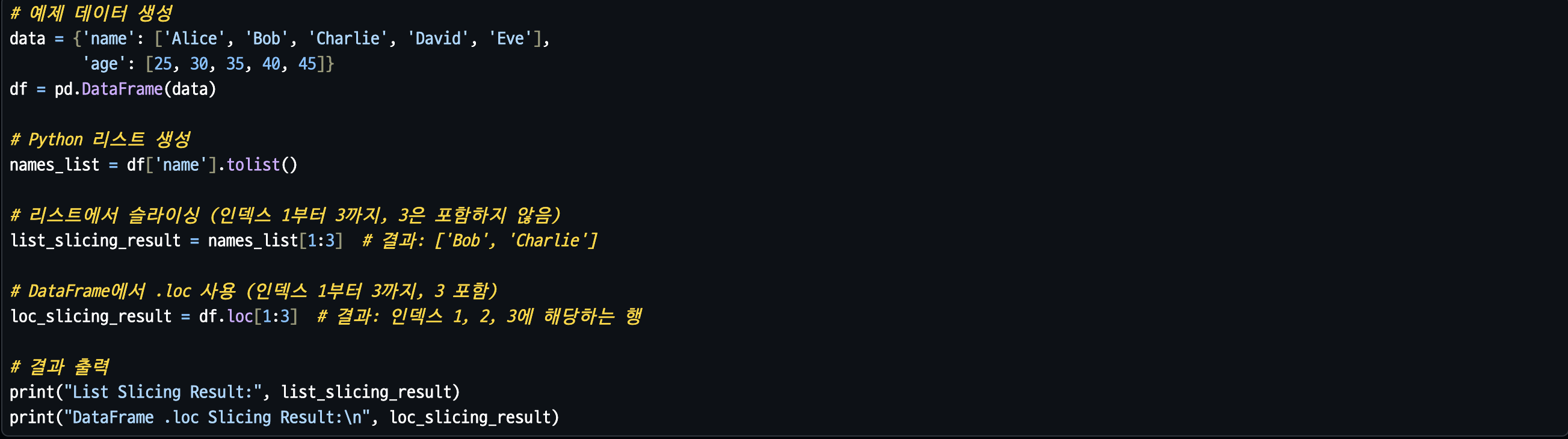 아래 코드를 보면 리스트의 슬라이싱은 stop을 포함하지 않으며, DataFrame의 .loc의 경우 stop을 포함하는 것을 알 수 있다.