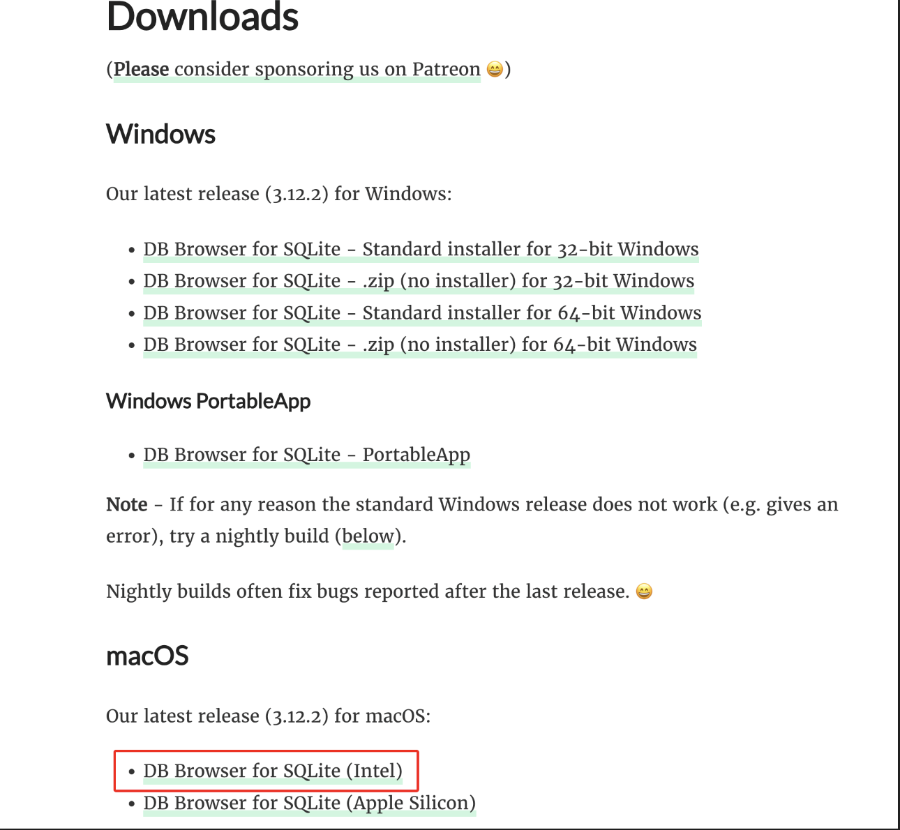 저는 Intel 맥북을 사용하고 있으므로 macOS에서 DB Browser for SQLite (Intel)을 클릭하여 다운로드 해주도록 하겠습니다.