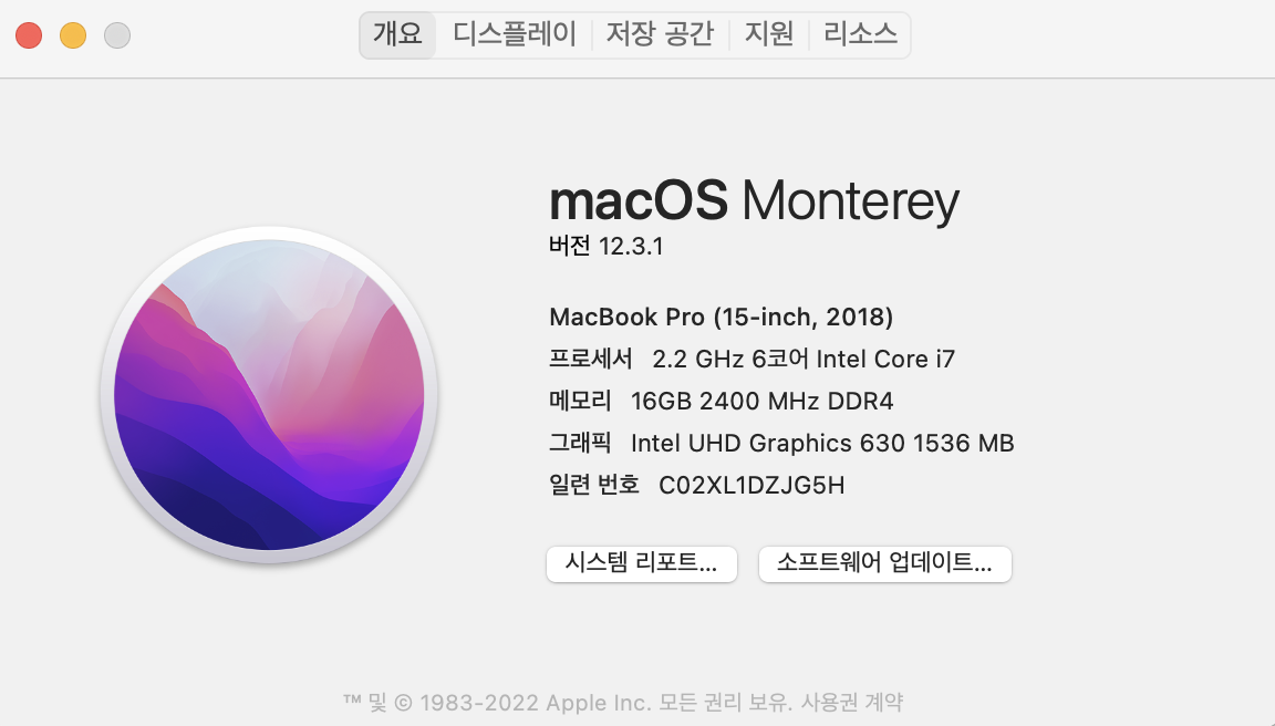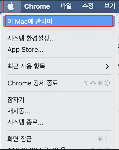 화면 좌측 상단에 애플 아이콘을 누른 후 "이 Mac에 관하여"를 클릭합니다.